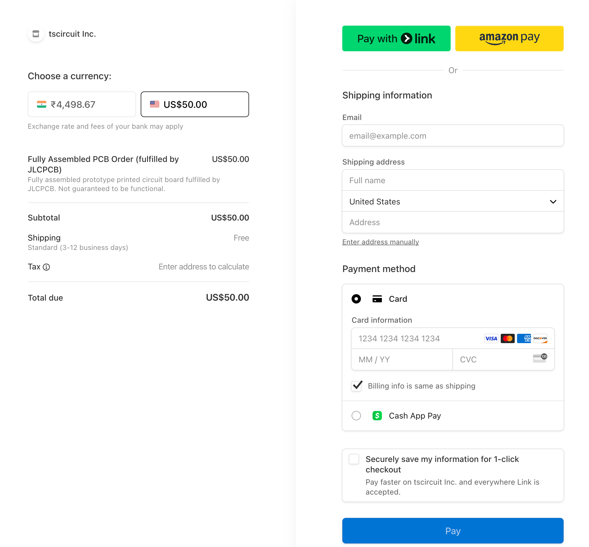 Finally, you'll be redirected to a secure Stripe checkout page where you can enter your payment details and shipping address. Your PCB will be delivered directly to your specified address.